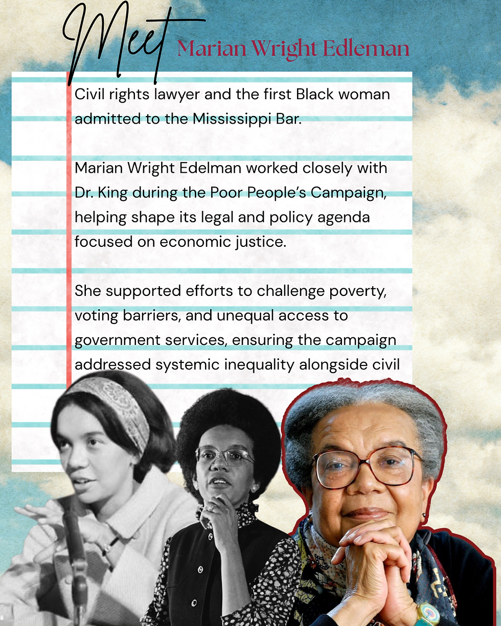Marian Wright Edelman broke barriers as the first Black woman admitted to the Mississippi Bar and worked closely with Dr. King during the Poor People’s Campaign. She helped shape its legal and policy agenda, making clear that civil rights was not only about racial equality, but about confronting poverty, voting barriers, and systemic exclusion. She went on to found the Children’s Defense Fund, where she continues that work today, advancing economic justice and advocating for children and families nationwide.